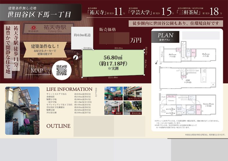 Works 土地 マイソク(東京都世田谷区) 不動産図面制作 2023.10.20 赤茶色を基調とした高級感のあるデザイン。 周辺施設の写真を掲載することで、デザインを華やかにし、視覚的にもよりわかりやすくしました。 最寄り駅の写真を背景に使うことで、立地の良い物件であることを印象付けました。 地図はQRコードにすることで、スマホですぐにGoogle Mapを確認できるようにしました。 オリジナルマイソク、B4横長、片面 マイソク雰囲気:高級感・シック色:ブラウン・ベージュ色:レッド色:シルバー・グレー間取図区画図地図QRコード << 土地 マイソク(神奈川県横浜市南区) | 一覧に戻る | 土地 マイソク(神奈川県茅ヶ崎市) >> 関連記事 中古マンション マイソク(東京都板橋区) 中古マンション マイソク(大阪府大阪市阿倍野区) 土地 マイソク(東京都八王子市) 投資用1棟新築アパート マイソク(東京都目黒区)