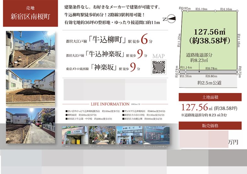 Works 土地 マイソク(東京都新宿区) 不動産図面制作 2023.01.06 赤を基調としたシンプルかつ高級感のあるデザイン。 周辺施設の写真も掲載することで、視覚的にわかりやすいマイソクを目指しました。 地図はQRコードにすることで、スマホですぐにGooglemapを確認できるようにしました。 アクセスなど、特にポイントとなる部分を赤色にして目立たせています。 オリジナルマイソク、B4横長、片面 マイソク雰囲気:高級感・シック色:レッド区画図地図QRコード << 中古マンション マイソク(東京都渋谷区) | 一覧に戻る | 土地 マイソク(東京都大田区) >> 関連記事 株式会社 飯塚土地管理様 webサイト制作 土地 マイソク(東京都豊島区) 土地 マイソク(東京都杉並区) 土地 マイソク(東京都千代田区)